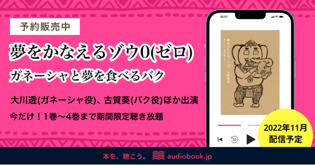 株式会社オトバンク( 本社:東京都文京区、代表取締役社長:久保田裕也、以下「オトバンク」)が運営する日本一のオーディオブック書籍ラインナップ数(※)の配信サービス「audiobook.jp」は、累計460万部突破した人気シリーズ「夢ゾウ」の最新刊『夢をかなえるゾウ0(ゼロ) ガネーシャと夢を食べるバク』(水野敬也著、文響社刊)をオーディオブック化し、2022年11月より「audiobook.jp」にて配信開始することを発表します。配信開始に先立ち、2022年8月18日より当サービスにて予約販売を開始します。さらに、本作のオーディオブック予約販売開始を記念して、2022年8月18日から2022年11月30日までの期間限定で、同じくドラマ形式で音声化した『夢をかなえるゾウ』シリーズ第2巻〜第4巻のオーディオブックを聴き放題プランで配信します。※日本マーケティングリサーチ機構2021年11月調べ。日本語オーディオブック書籍ラインナップ数調査。