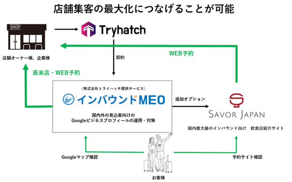代理店契約の締結により、当社サービス「インバウンドMEO」の追加オプションとしてSAVOR JAPANを付与することで、MEO対策を行いつつ、WEBを通した予約まで一気通貫で集客支援を行うことが可能です。