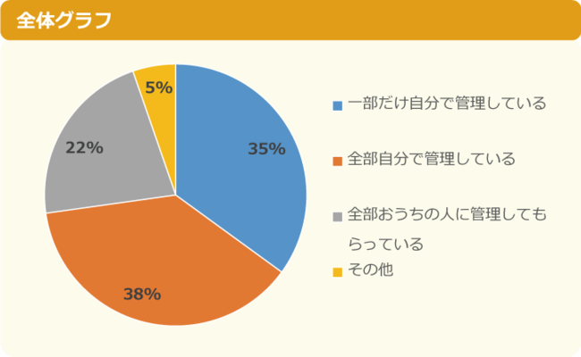 小学生では「一部だけ自分で管理している」と答えた人が36%で、「全部自分で管理している」と答えた人は35%とあまり差のない結果になりました。中学生になると「全部自分で管理している」と答えた人が43%になり、小学生に比べると自分で管理するようになった人が増えています。