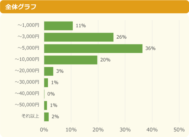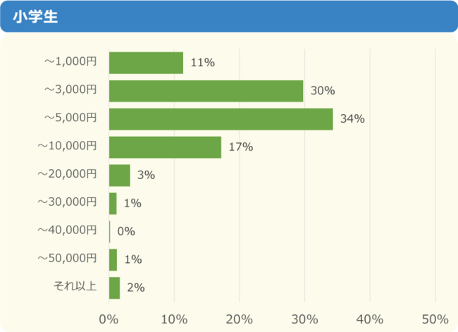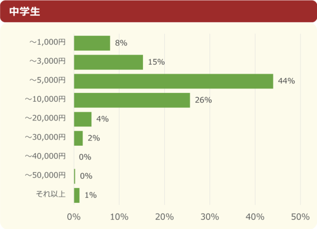 小学生は1位が「3千円〜5千円」で34%、2位が「千円〜3千円」で30%、一方、中学生は1位が「3千円〜5千円」で44%、2位が「5千円〜1万円」で26%という結果になりました。
