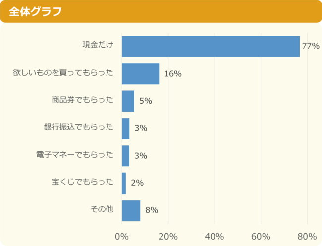 全体の回答は「現金だけ」が77%と1位で、ほとんどの人が現金でもらっているようです。