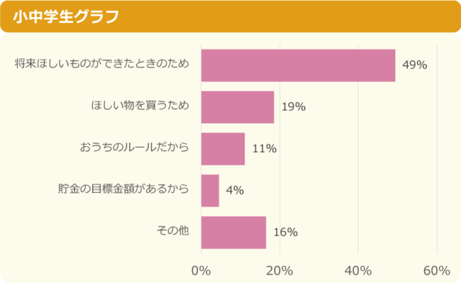 貯金をする理由は「将来欲しいものができたときのため」が49%で、約半数を占めて1位となりました。2位は「欲しい物を買うため」で、3位は「おうちのルールだから」と続きます。2021年のアンケート結果でも同じ順位となっていました。