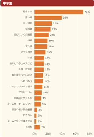 中学生の5位に入った「遊びに行く交通費」は、小学生での 7%から中学生では20%と増えており、行動範囲が広がっている様子がうかがえます。