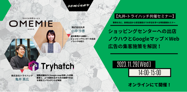 株式会社ベクトル(本社:東京都港区、代表取締役会長兼社長:西江 肇司、東証プライム:6058)の子会社である株式会社トライハッチ(東京都新宿区、代表取締役社長、武藤 尭行、以下「当社」)は、マルイ店舗への出店を簡単に申込みできるオンラインサービス『OMEMIE(オメミエ)』を運営する株式会社丸井(本社:東京都中野区、代表取締役社長:青野 真博、以下丸井)と共同で、無料オンラインセミナー「ショッピングセンターへの出店ノウハウとGoogleマップ×Web広告の集客施策を解説!」を11月29日(水) 14:00〜15:00に開催いたします。