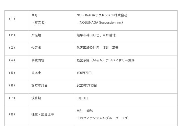 当社の経営承継に関するノウハウと十六フィナンシャルグループの営業基盤・ネットワークを融合し、地域企業の経営承継問題の解決に貢献し、地域経済の持続的成長を支援することを目的に、2023年7月3日に合弁会社を設立し、事業を開始いたします。