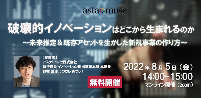 アスタミューゼ株式会社(本社:東京都千代田区、代表取締役社長 永井歩)は、2022年8月5日(金)14:00〜15:00に、事業会社にて新規事業の創出や立ち上げに従事されている方を対象とした無料ウェビナー「破壊的イノベーションはどこから生まれるのか〜未来推定&既存アセットを生かした新規事業の作り方〜」を開催いたします。