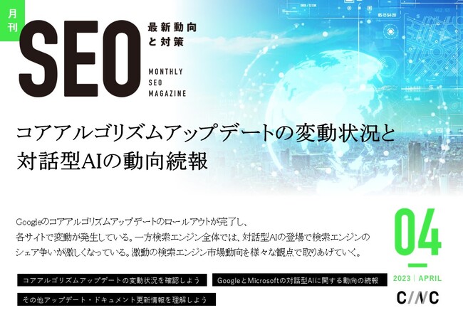 株式会社CINC(東京都港区 代表取締役社長 石松友典、以下 CINC)は、毎月特定のテーマのSEO最新動向と対策についてレポートする「月刊SEO」の4月号を公開しました。