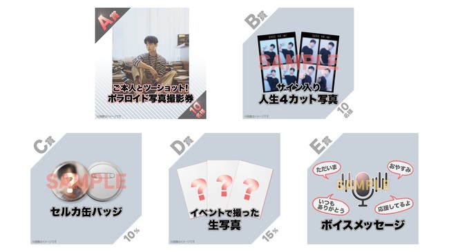 ご本人とツーショット撮影ができる『ご本人とツーショット!ポラロイド写真撮影券』や、サイン入りアイテムが当たる『サイン入り人生4カット写真(ランダム)』など、豪華賞品をご用意しております。その他にも『セルカ缶バッジ(ランダム全5種)』や『イベントで撮った生写真(ランダム全5種)』、『ボイスメッセージ(ランダム全20種)』など、いずれかの特典が当たるハズレなしのくじとなります。この機会をお見逃しないようご利用ください。