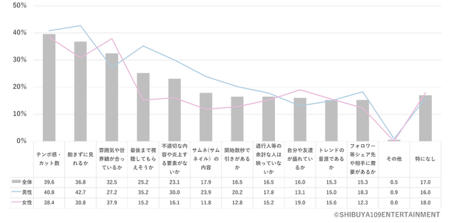 動画編集をするにあたり、「テンポ感・カット数(39.6%)」「飽きずに見られるか(36.8%)」「雰囲気や世界観が合っているか(32.5%)」が意識していることとして上位となりました。また、ショート動画の定義となる尺や、編集時間、投稿場所には男女差も見られました。