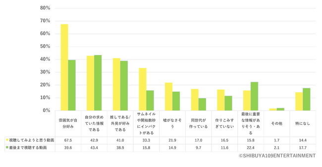 自分が視聴してみようと思う動画については「雰囲気が自分好み(67.5%)」「自分の求めていた情報である(42.9%)」「推しである/外見が好みである(41.0%)」が重視されており、最後まで視聴する動画についても「自分の求めていた情報である(43.4%)」「雰囲気が自分好み(39.6%)」「推しである/外見が好みである(38.9%)」※図17と似通った要素が重視されていることがわかります。