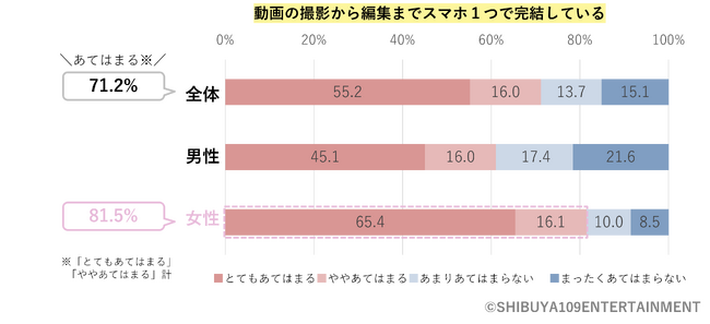 実際に動画を作る上で、「動画の撮影から編集までスマホ1つで完結している」※図10と回答したのは71.2%となりました。特に女性は81.5%と非常に高い割合になっています。