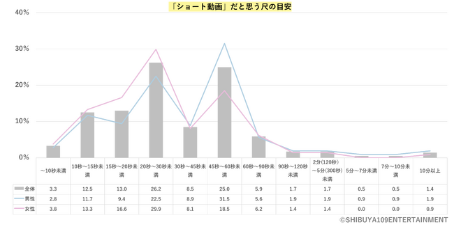 動画編集方法について知る情報源についても、男性は「動画配信サービス(ショート以外)(42.3%)」が最も多くなったのに対して、女性は「TikTok(42.2%)」※図14が最も多くなっています。ショート動画だと思う尺の目安※図15についても、男性は「45~60秒未満」 が31.5%で最も多くなったのに対し、女性は「20~30秒未満」が29.9%が最も多くなり、女性の方が「ショート動画」について少し短いものをイメージしていることがわかります。同じ短い動画についての話題でも、男女でイメージする長さや投稿するプラットフォームが異なっていることがわかります。