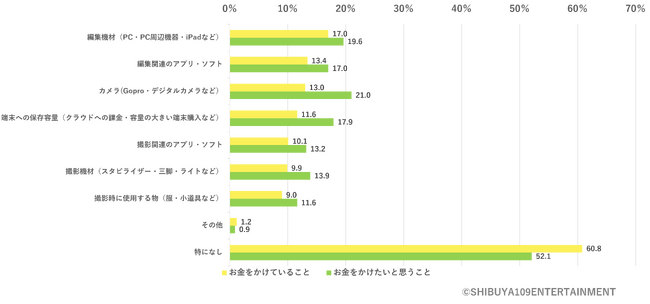 動画編集にかけているお金に関して、全体では「お金は使わない(55.0%)」※図8が最多の回答でした。お金をかけていること「特になし(60.8%)」、お金をかけたいこと「特になし(52.1%)」※図9という回答が最も多いことから、動画編集はお金をかけずに日常的に楽しむアクティビティになっているようです。