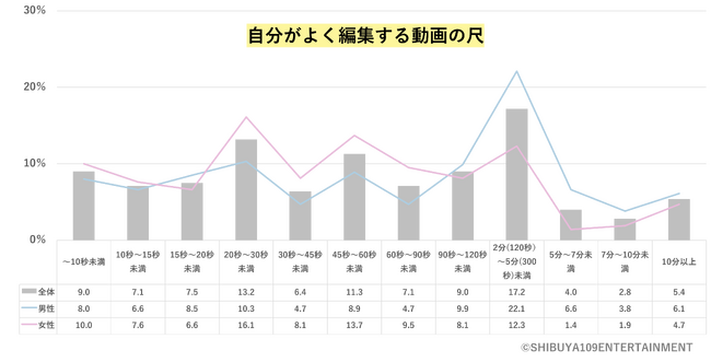 編集する動画の尺についても男女で違いがいくつか見られました。まず、自分がよく編集する動画の尺※図12は、全体では「2分〜5分未満(17.2%)」が最も多い回答となり、男性も同様に「2分〜5分未満」が22.1%で最多となった一方、女性は「20~30秒未満」が16.1%と最も多く、全体と比較すると短めである傾向がわかります。