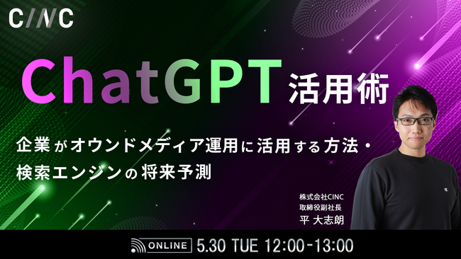 株式会社CINC(シンク、以下CINC)は、2023年5月30日(火)にオンラインセミナー『ChatGPT活用術 〜企業がオウンドメディア運用に活用する方法・検索エンジンの将来予測〜』を開催いたします。
