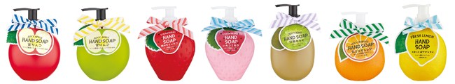思わず並べたくなるようなフルーツフォルムとおいしそうな香りはそのままに、うるおい成分としてそれぞれのフルーツから抽出されるエキスを配合しました。フルーツとビタミンカラーで、1年を通して「手洗い」が楽しくなります。