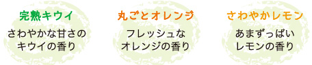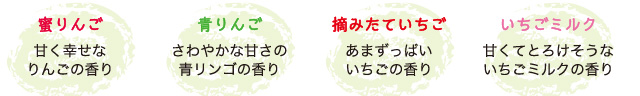 蜜りんご、青りんご、摘みたていちご、いちごミルク、完熟キウイ、丸ごとオレンジ、さわやかレモン