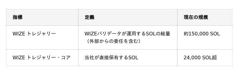 当社はソラナ・トレジャリー事業の成長指標として、WIZEバリデータが運用するSOLの総量を示す「WIZE トレジャリー」と、当社が直接保有するSOLを示す「WIZE トレジャリー・コア」の2つを設定しています。今回、DoubleZeroから約24,300 SOLの委任を獲得できたことは、「WIZE トレジャリー」の拡大を後押しするものであり、当社の事業成長を大きく前進させる成果です。[表: https://prtimes.jp/data/corp/37860/table/250_1_c04d3bafc52e93fd0a9ddc713ed8b747.jpg?v=202604080845 ]