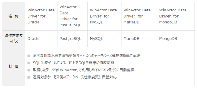 今回は、「WinActorでデータベースを簡単・安全に利用できないか」、「データベースを利用したいが、SQL文を作るのが難しい」というお客様のご要望を受けて、「WinActor」を利用して主要データベースとの連携を簡単に実現する新たなラインアップを提供することとしました。