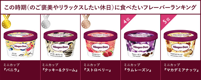 「この時期(のご褒美やリラックスしたい休日)に食べたいフレーバー」を聞いたところ、全体では、ミニカップ『バニラ』(47.3%)、ミニカップ『クッキー&クリーム』(40.3%)、ミニカップ『ストロベリー』(39.7%)がランクインする結果となりました。