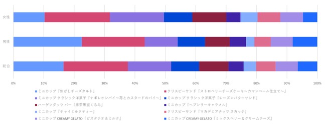 同ランキングを性別で比較すると、男性はミニカップ『焦がしチーズタルト』(22.5%)が人気を集め、続いて、クリスピーサンド『ストロベリーチーズケーキ〜カマンベール仕立て〜』(20.7%)がランクインしました。一方女性は、クリスピーサンド『ストロベリーチーズケーキ〜カマンベール仕立て〜』(21.5%)、ミニカップ クラシック洋菓子『ナポレオンパイ〜苺とカスタードのパイ〜』(17.8%)が人気を集める結果となり、全体結果で人気が集中した3商品は、性別を問わず広く好まれていることがわかる結果となりました。
