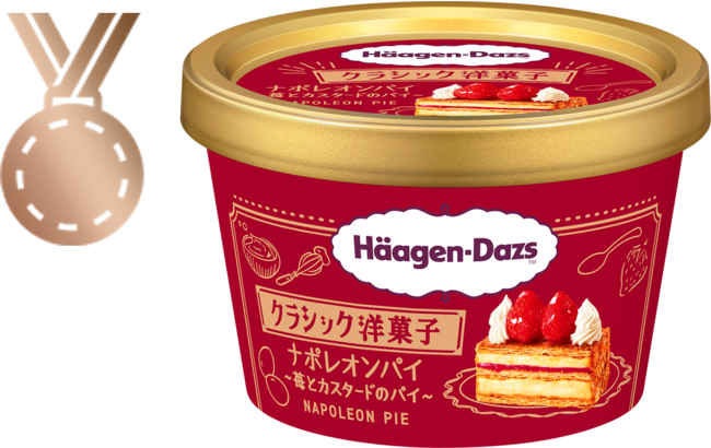 “ナポレオンパイ”をハーゲンダッツ流にアレンジ。まろやかでコクのあるカスタードアイスクリームに、果肉入りイチゴソースを合わせ、その上にカスタード風味コーティングを施しました。天面には香ばしいパイをトッピングし、サクサクした食感も楽しめます。