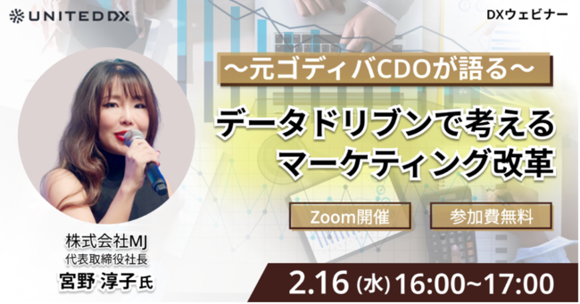 ユナイテッド株式会社(本社:東京都渋谷区、代表取締役社長 兼 執行役員:早川 与規、証券コード:2497、以下:ユナイテッド)は、2022年2月16日 (水) 16:00〜17:00に株式会社MJ 代表取締役社長 宮野 淳子 氏を迎え、「〜元ゴディバCDOが語る〜データドリブンで考えるマーケティング改革」と題した参加費無料のウェビナーを開催することをお知らせいたします。
