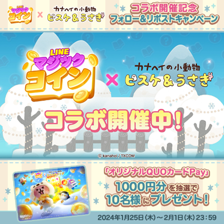 コラボ開催を記念し、リポストキャンペーンを開催します。「LINE マジックコイン」の公式X(旧Twitter)アカウントをフォローして対象の投稿をリポストすると、抽選で10名様にコラボ限定のオリジナルQuoカードPay 1,000円分が当たります。奮ってご参加ください。