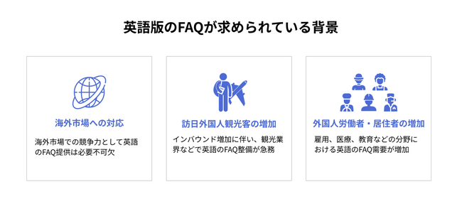 外国人労働者にとって英語でのサービス提供は重要です。外国人労働者・居住者の増加は、雇用、医療、教育などの分野におけるFAQの需要の増加につながります。適切な情報展開が、日本での安心できる暮らしを支えます。