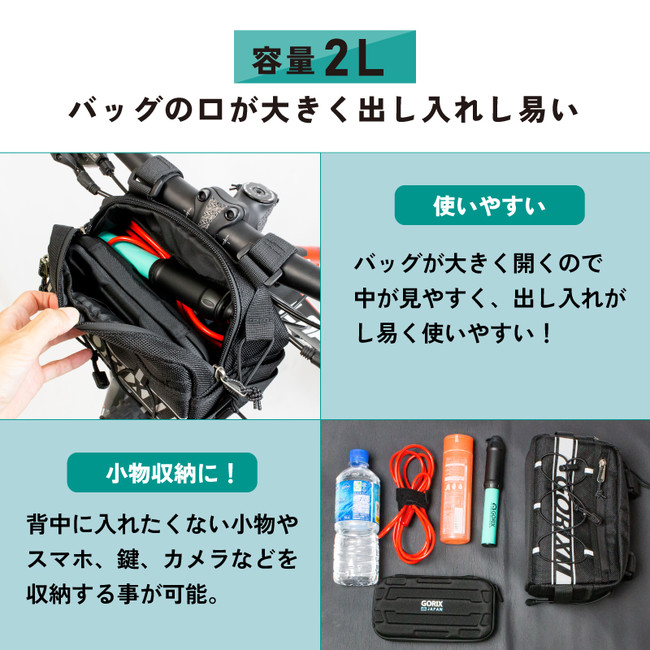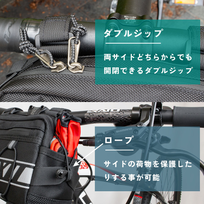 普通のライドに丁度良いサイズのフロントバッグで、補給食や小物類、ギア等、背中に入れたくないスマホやカメラなどの収納に適しています。防水撥水生地採用で多少の雨でも対応します。