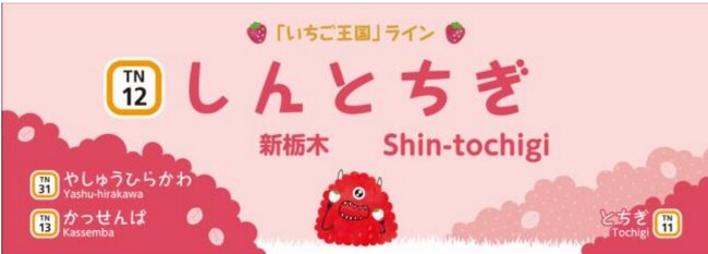 「いちご王国」ラインを印象づけるため、宇都宮線全12駅の看板を赤とピンクを基調とし、いちごのイラストを施した「いちご王国」仕様とするほか、宇都宮線を中心に運行する20400型の車両1編成の車内外に、いちごの装飾をまとわせた「ベリーハッピートレイン」を期間中に運行するなど、東武宇都宮線はいちご一色となります。