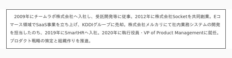 「プロダクトマネージャーとして入社した当初は、良いプロダクトを作ることだけを考えていました。しかしSmartHRで働くなかで、良いプロダクトを作れる組織のほうに関心をいだくようになり、私の仕事はプロダクト作りから組織作りへと変わっていきました。今や私にとっては、組織がプロダクトです。SmartHRはこの数年で、単一プロダクトからマルチプロダクトの会社に進化を遂げました。今後も複数の領域で価値を生み出していくために、私たちはこれまで以上に自律的で、機敏で、より顧客志向な組織になっていく必要があります。SmartHRの皆さんと共に、新しい組織や文化、そして真に価値ある使いやすいプロダクトを作るために、力を尽くして参ります。」
