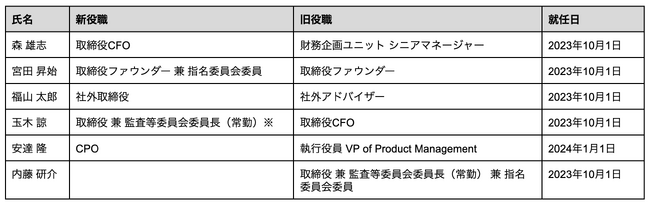 取締役CFOに就任する森は、2021年6月に実施した約156億円のシリーズD資金調達の牽引や日々の投資家との面談を通して当社の財務戦略に大きく貢献し、2022年、現CFO玉木の推薦により次期CFO候補となって以降は、当社の財務戦略の中枢を担ってきました。これまでの経験と手腕を活かし、今後は取締役CFOとして未来を見据えた財務戦略の立案と実行に尽力してまいります。また、玉木は森にCFOを引き継いだ後、強みである監査領域の知見を活かし、これからの組織規模や事業成長により適した監査業務を行ってまいります。なお、内藤の退任に伴い指名委員会委員は、企業カルチャーを尊重した選解任の維持を期待して、これまでの経営陣の抜擢実績を持つ取締役ファウンダーの宮田が後任を務めます。