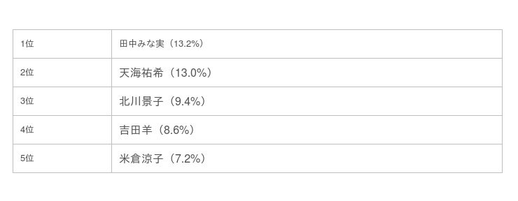 ・1位:田中みな実(13.2%)2位:天海祐希(13.0%)3位:北川景子(9.4%)