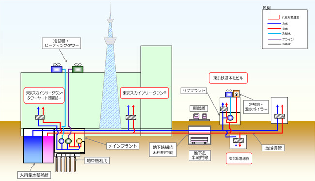 東京スカイツリータウンをはじめ、その周辺地域では、熱供給システム(DHC)を導入しています。熱供給システムは、1か所または複数のプラントで冷水・温水等を作り、地域導管を通して一定地域内の冷暖房等を行うシステムです。
