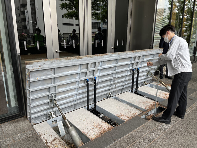 水害の際に、建物内への浸水を防止するための防潮板(目張り)を、東京スカイツリータウン1階に41か所設置しています。
