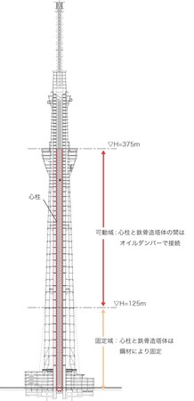東京スカイツリーの中央部には心柱(しんばしら)と呼ばれる鉄筋コンクリート造の円筒があります。心柱と鉄骨造のタワーは構造的に分離しており、心柱と塔体の揺れの周期の違いによってタワー全体の揺れが相殺される制振システムです。