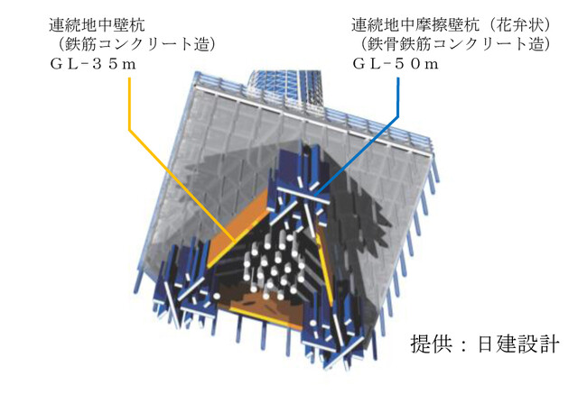 東京スカイツリーの3本の脚の下には、地下50mに達する壁状の杭が花弁状に配置してあります。これは、杭の表面積を大きくすることで地盤との摩擦を増やし、硬い地盤を掴むことで地震や強風時の揺れにより基礎が引き抜けないようにしています。また地震や強風の力で基礎が水平に歪まないよう、頂点を結ぶように板状の杭を配置してあります。