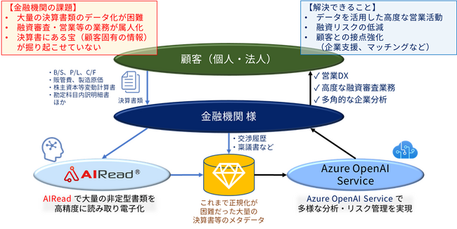 地方金融機関が抱える課題として、公開情報が少ない地方中小企業から受領する大量の決算書等のデータ化と分析が困難であり、その結果、融資審査や営業などの業務が個々の担当者に依存していることが挙げられます。これらの課題を、AI-OCR(AIRead)と Microsoft 社の生成 AI の積極的な活用により克服できないかを検証いたします。