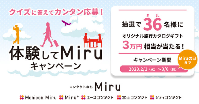 株式会社メニコン(本社:名古屋市中区葵三丁目21-19、代表執行役社長:田中英成)は、『Miruの日』を記念し、抽選でオリジナル旅行カタログギフト3万円相当が36名に当たる「体験してMiruキャンペーン」を、2023年2月1日から2023年3月6日まで開催することをご案内いたします。