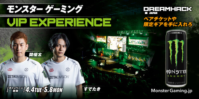 モンスターエナジーは、2023年5月13日(土)、14日(日)に開催される「DreamHack Japan 2023 Supported by GALLERIA」をオフィシャルドリンクスポンサーとしてサポートいたします。開催を記念して、ZETA DIVISION 関優太・すでたきとのミート&グリートが付いた「DreamHack Japan 2023 Supported by GALLERIA」のペアチケットやキャンペーン限定デザインのZETA DIVISIONオリジナルTシャツなどが当たる「モンスター ゲーミング VIP EXPERIENCE」 キャンペーンを実施いたします。