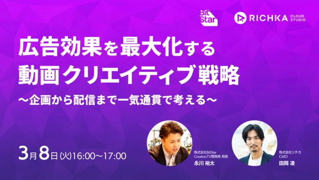 株式会社BitStar(本社:東京都渋谷区、代表取締役 社長執行役員CEO:渡邉拓、以下BitStar)と株式会社リチカ(本社:東京都渋谷区、代表取締役:松尾幸治、以下リチカ)は、3月8日(火)16:00よりウェビナー「広告成果を最大化する動画クリエイティブ戦略〜企画から配信まで一気通貫で考える〜」を共催いたします。