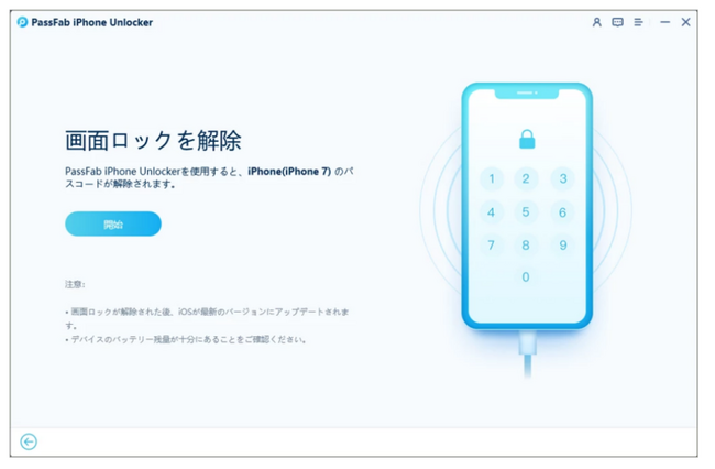 Step2:iPhone/ iPadをパソコンに接続します。Step3:「開始」をクリックするとiPhone/ iPadのロックが解除されます。