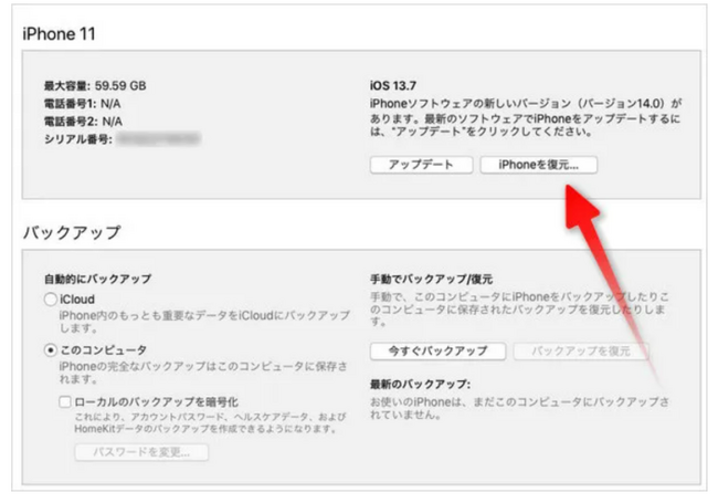 iTunesには音楽だけでなくiOSデバイスを管理する機能もあります。ただし、こちらの方法ではデバイスが初期化されてしまいますので、データをバックアップする必要があります。バックアップを取っていれば、初期化した後データを復元することができます。Step1:iTunesをパソコンで起動し、USBケーブルでiPhone/ iPadを接続します。