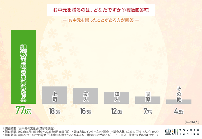 「お中元を贈るのは、どなたですか?(複数回答可)」と質問したところ、『親族(両親、兄弟姉妹など)(77.6%)』と回答した方が最も多く、次いで『上司(18.3%)』『友人(16.5%)』と続きました。