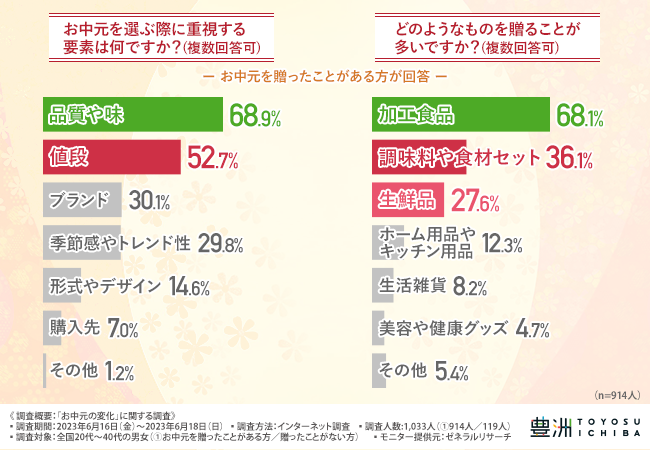 『豊洲市場ドットコム』(https://www.tsukijiichiba.com/)を運営する株式会社食文化(本社所在地:東京都中央区、代表取締役:萩原 章史)は、全国20代〜40代の男女(1.お中元を贈ったことがある方/2.贈ったことがない方)を対象に、「お中元の変化」に関する調査を実施しました。