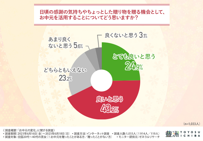 「日頃の感謝の気持ちやちょっとした贈り物を贈る機会として、お中元を活用することについてどう思いますか?」と質問したところ、6割以上の方が『とても良いと思う(24.9%)』『良いと思う(43.2%)』と回答しました。