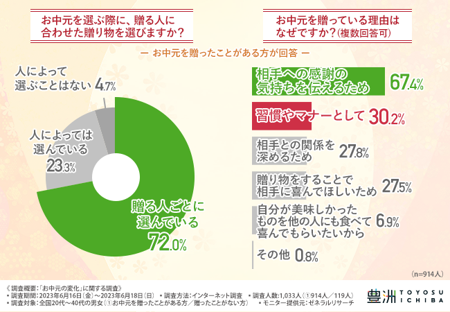 習慣やマナーとしてよりも、日頃の感謝の気持ちを伝えるためにお中元を贈っており、さらに贈る人に合わせて贈り物を選んでいる方が非常に多いようです。