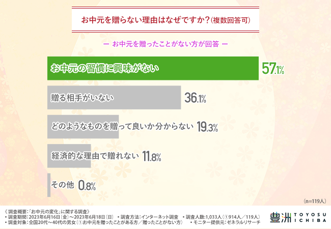 「お中元を贈らない理由はなぜですか?(複数回答可)」と質問したところ、『お中元の習慣に興味がない(57.1%)』と回答した方が最も多く、次いで『贈る相手がいない(36.1%)』『どのようなものを贈って良いか分からない(19.3%)』と続きました。