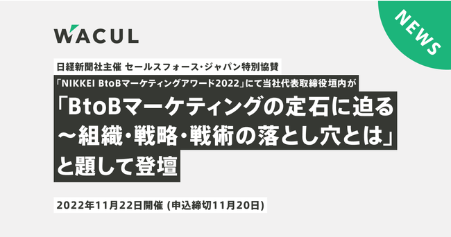 データ分析ツール「AI アナリスト」でマーケティングDXを自動化する株式会社WACUL(住所:東京都千代田区、読み:ワカル、代表取締役社長:大淵 亮平、証券コード:4173、以下当社)は、日経新聞社主催 セールスフォース・ジャパン特別協賛のセミナーに当社代表取締役の垣内勇威が『BtoBマーケティングの定石〜なぜBtoBマーケティングの大半は失敗に終わるのか?』と題して登壇することをお知らせします。BtoBマーケティングの専門家である垣内は「BtoBマーケティングの定石」を11月24日に出版するため、その書籍に基づいたトークを行います。